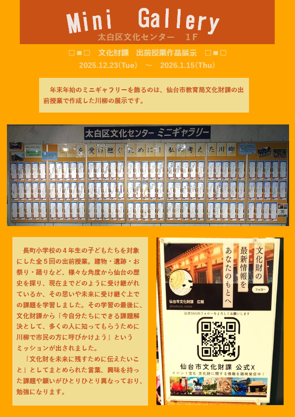仙台市教育局文化財課による出前授業で作成された川柳を展示中です。