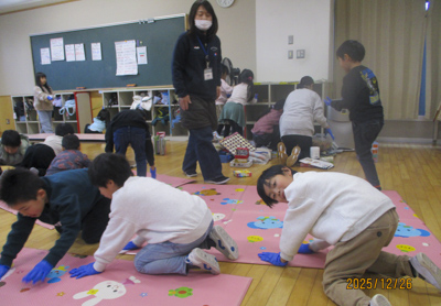 園庭は寒い中落ち葉かき、遊戯室は窓拭きや床掃除、図書室集会室は、ロッカーの水拭き、おもちゃの整理や本の整理、玄関は靴箱の水拭き等をそれぞれの場所で一生懸命きれいにしました。