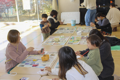 カフェオレや紅茶等、お好みの飲み物を片手に、七郷地区の子育てマップを囲んでおしゃべり。