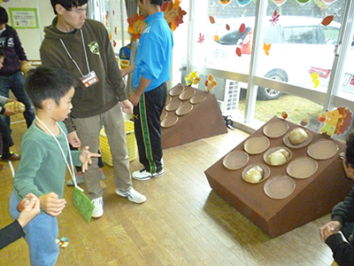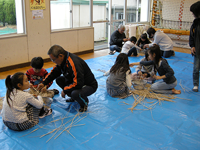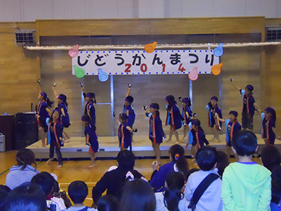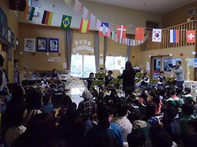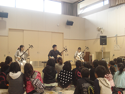 2014/11/01仙台市震災復興のための芸術家派遣事業として、津軽三味線日本一の実力派・柴田三兄妹をお迎えして生の演奏を鑑賞しました。津軽三味線の代表曲である「津軽じょんがら節」や数々のオリジナル曲、さらに、みんなが知っている「アナと雪の女王」ゲーム曲「スーパーマリオ」など、兄妹の軽妙なおしゃべりも交えた演奏が続きました。楽しい演奏会に子供たちは乗り乗りで、一緒に歌ったり掛け声をかけたりして大盛り上がり。体験コーナーでは、代表の子供たちが緊張しながらも真剣に挑戦しました。地域のお年寄りの皆さんも多数お集まりいただき、子供たちとともに楽しんでいただきました。