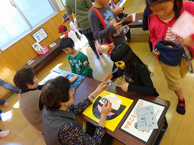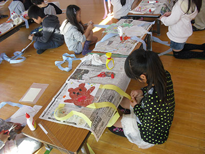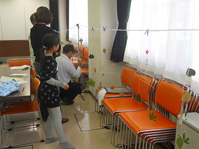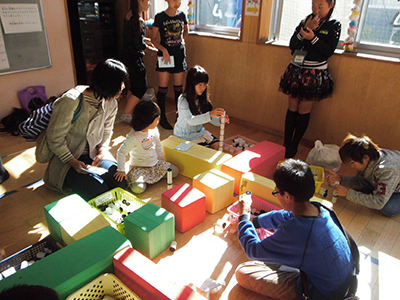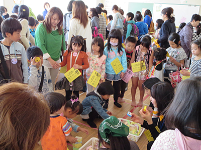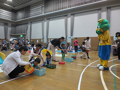 2014/10/25片平、台原、上杉、東六番丁児童館と5館合同で、「みんなともだち!ちびっこうんどうかい」が開催されました。年齢ごとの親子競技では、0歳児は「それいけパンダ・うさぎ・コアラレース」、1歳児は「お魚とったぞ~!!」、2・3歳児は「できるかな?はじめてのおつかい」を行いました。それぞれのペースに合わせて頑張る姿がとても可愛らしかったです。たくさん集まってくださったお父さんたちも大活躍でした。その他にも、トトロをモチーフにした玉入れや、大人が本気で行う玉入れもありました。普段は別々の児童館を利用している方同士の交流にもなり、笑顔あふれる楽しいうんどうかいでした。