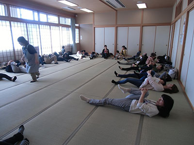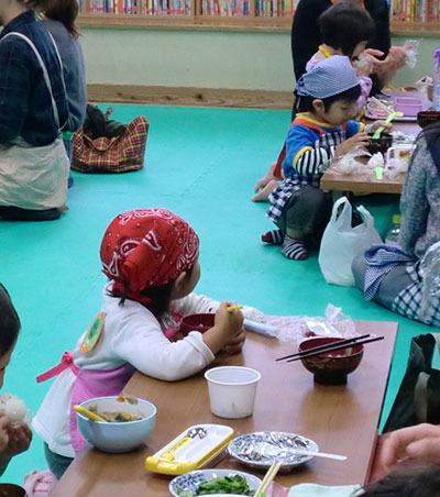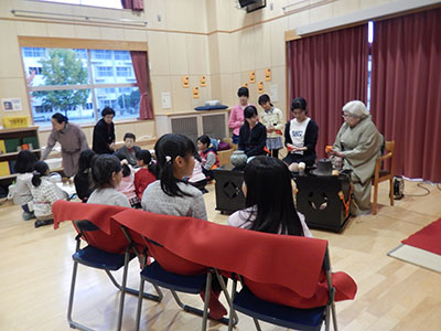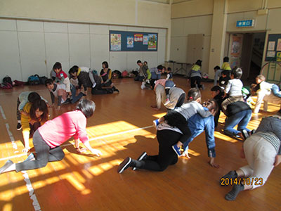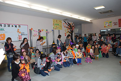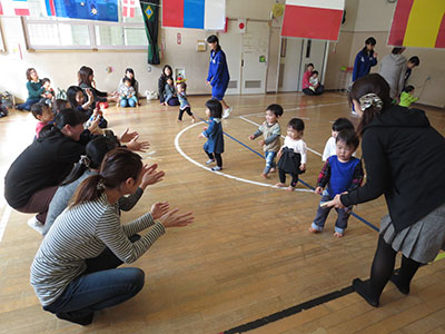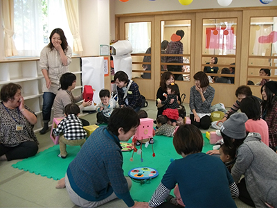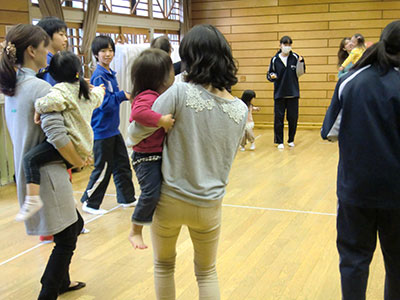 2014/10/24音楽に合わせLet’sEnglish! おなじみ萱場蓉子先生による幼児の英語遊びの時間です。今回は職場体験の中学生7名も一緒に参加して、英語の歌やダンスを楽しみました。なんといっても今回参加者が一番乗ったのは、HokeyPokeyダンス!ママに抱っこされた赤ちゃんも、体を左右に出しながらゆらゆら揺れるアクションに大喜び。ママは、赤ちゃんを抱っこしながら体をひねり軽いフィットネス!中学生は、Rightshoulder Leftshoulder等と言われるたびに頭の中で一生懸命に日本語変換! いつものように最後はロンドン橋落ちたの歌遊びを楽しんで、英語遊びのレッスンを終了しました!