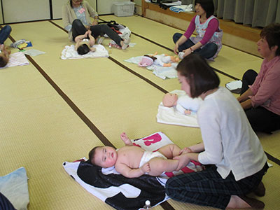 6月の「ゆみこさんのベビーマッサージ」に続き今年2度目です。ママの気持ちに余裕がある時ならいつでも始められるスキンシップです。歌に合わせて“〇〇ちゃんのマッサージ”優しいママのマッサージで赤ちゃんもうっとりでした。