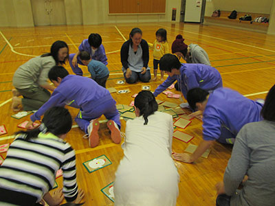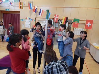 2、3歳児親子登録制の幼児クラブ。今回の活動は「ミニうんどうかい」。いつもの「サンサン体操♪」のあとは、玉入れ、プレイバルーン。最後はせんべいとり競争をしました。