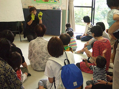 森っこルン♪ルンる~むは、概ね月に2回開催している貝ヶ森児童館の定例行事です。「たんぽぽ文庫」を主宰する、竹丸富子さんによるわらべ歌あそびやパネルシアター、絵本の読み聞かせなどのゆったりした世界に、ママも子どもたちも惹きこまれていきます。