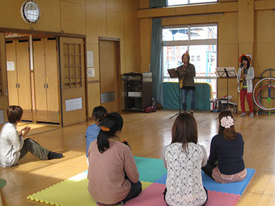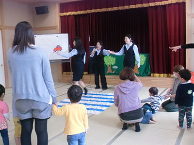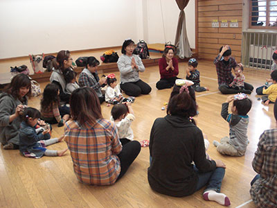 “なべなべ底抜け、そこが抜けたらかえりましょ!”のおなじみの歌で始まり、お手玉を背中に乗せてお馬になったり、ママと向かい合わせで“ぎっちらこ”お船をこいだり、親子でリズムに乗って楽しいひと時を過ごしました。ママと子供がしっかり目と目を合わせ、心と心を通わせている様子が感じられました。正に“わらべうた”は、子供とお母さんを楽しく繋げてくれる魔法のことばですね!