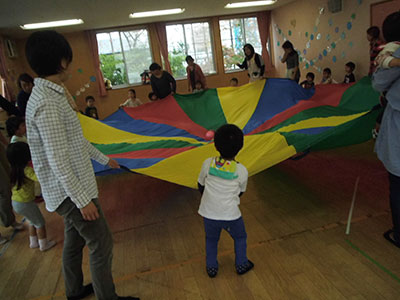 プレイバルーンはみんな大興奮。お母さんたちも一緒に大きなバルーンを広げて、くるくる回ったり、波を作ったり。大きなテントにしてみんなで入ったりしました。