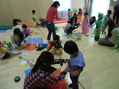 ハロウィーンムードまっただ中でしたが、あえてお化けに限らずどんな衣装でもOKのファッションショーをしました。お母さんが我が子に似合うコスチュームをデザイン・製作し、子どもたちがノリノリの音楽に合わせてひとりひとり舞台をウォーキング&最後に決めポーズ!! 職場体験中の中学生モデルの素晴らしいお手本につられたのか、みんな上手にウォーキングし、本物のモデルさんも顔負けのポージングでした。お姫様のドレスあり、仮面ライダーのコスチュームあり、「黒松オータムコレクション2014」は力作ぞろいでした。