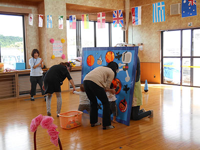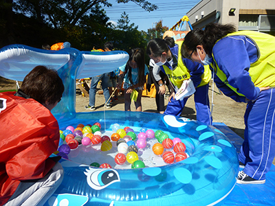 2014/10/18今年度は、小学生のチアダンスK-PLUM'Sが初めてステージ発表を行いました。笑顔で元気にパフォーマンスすることができました。児童館まつりでは、「とり+かえっこ」を行いました。家から持ってきたおもちゃを「カエルポイント」に交換し、そのポイントを使ってほしいおもちゃを買うことができるという遊びです。ゲームやお仕事をしてポイントをためることもできます。小学生スタッフが考えたおもしろいゲームも大人気でした。「次は何をしようかな。」と子どもたちの表情は生き生きとしていました。様々な方法でポイントをため、自分の欲しい物を手に入れることは、子どもたちにとってとてもよい機会となりました。