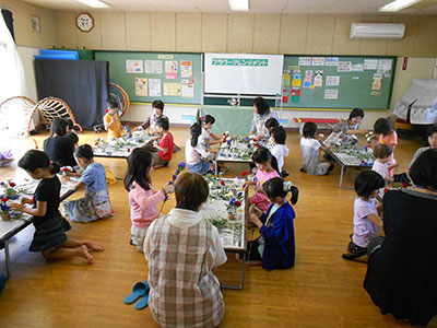 今回の紙すきは、紙すきと染め物を同時に楽しむことができる内容でした。初めての紙すきに大人も子どもも目を輝かせ真剣なまなざし!キバナコスモスで秋色に染めたり、秋の花や色付いた葉っぱをすき込んだり…思い思いのはがきが出来上がりました。『このはがきでおばあちゃんにお手紙書くの…』とほほ笑む子や『見て見て!こんな色になったよ~』と満足そうな顔、『お家では道具が無いから出来ないね~』とつぶやく親子にこんな方法があるよ!と伝えたら『早速挑戦してみようね』とのこと。小さな秋を満喫した時間となりました。