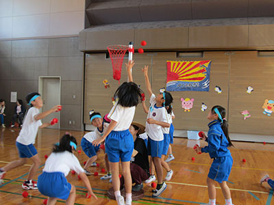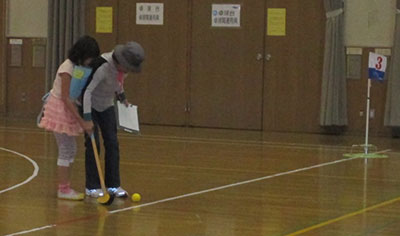 デコボコのボールとクラブで五つのコースをグループ毎にまわりました。髙橋先生の他に2名の優しい先生のサポートもあり、「もっとやりたい」の大合唱!1位から3位までは1打差の接戦、ホールインも出てとても白熱した戦いでした。
