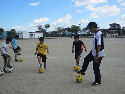 「まーちゃん」は川平小学校教務主任の我妻松彦先生です。当日まで「まーちゃん」が誰なのか秘密でした。当日「まーちゃん」が判明して、子ども達はびっくりもしましたがサッカーが大好きな子ども達が集まり、楽しくも熱心な参加がみられました。初心者向けだったので、まずはボールに慣れるところから始めました。ボールをおでこに乗せる。ボールを腰の周りで落とさないように回す。ボールを上に上げて拍手してキャッチなど。身体をほぐし、ボールに慣れた頃に2人組でドリブルリレーなどゲームの要素を入れ楽しめました。広い校庭を使い全身を動かし心地よい汗をかきました。終了後に皆で食べたアイスは格別な味がしました。