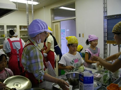 鮮やかな人参のもみじに、ぷっくりした黄色い栗、その間をうめ尽くす小さなシメジ!“秋の味覚ごはん”に思わず食欲もそそられます。主に高齢者への配食事業を行っている地域のNPO法人あかねグループさんとの共催事業“親子で料理”に、小学生親子10組が参加して秋の味覚作りを楽しみました。この他に、ぷりぷりのエビシュウマイ、菊の花びらを散らしたお吸い物、サツマイモの白玉しるこ、色彩鮮やかなミモザサラダと秋がいっぱい広がるおいしいメニューを親子で作り、味わいました。お家に帰ってから、きっと親子でおいしい秋を家族の皆さんにも分けて差し上げたことでしょうね!