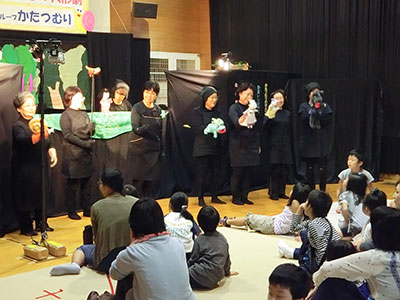 乳幼児親子や小学生の他、家族連れ、おじいちゃんやおばあちゃんも参加できる行事として、普段はなかなか見る機会がない人形劇を行いました。人形劇を長年続けている「かたつむり」さんに来ていただき土曜日のひと時を楽しみました。当日は、幼児親子から祖父母まで多くの参加があり、みんな集中して観ていました。また、劇終了後に人形さんたちが観客の中に出て来てふれあう事ができ、より人形に親しめました。