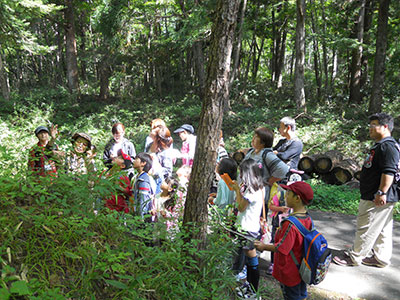 地域の方の案内で、「キツネノボタン」や「ヒツジグサ」などいろいろな植物の名前や特徴を教えていただきながら、森の中を歩きました。途中、クイズタイムやおやつタイムもあり、あっという間の一時間でした。