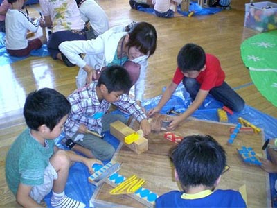 仙台市震災復興のための芸術家派遣事業の中の美術プログラムである「トントントントンくぎ打ち遊び」が行われました。舞台芸術家の大沢佐智子さんによるオブジェ創作プログラムで、事前申込の31名が全員参加し充実した90分間を過ごしました。「好きな板を選んでみよう!そこに好きなように釘を打ってみよう。その釘にお気に入りの毛糸を引っ掛けてみよう!」というキャッチフレーズの通り、自由で創造的、魅力に満ちた時間となりました。大沢佐智子さん扮する「サッチー工務店店長」とメンバーの皆さん扮する「社員」にアドバイスを受け、子供たちは大満足で瞳を輝かせていました。