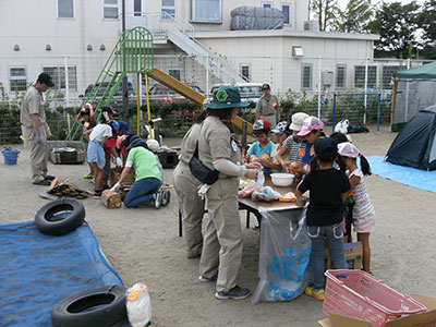 9月20日、さわやかな青空のもと、中田地域を中心に活動しているボーイスカウト仙台第28団の皆さんと一緒にディキャンプを行いました。最初は皆でテント設営に挑戦。子ども達が意見を出し合いながら、なんとか完成しました。お次はお待ちかねのカレーライス作り。はじめての包丁を使っての皮むき、はじめてのマッチつけ、はじめての米とぎなどそれぞれが担当に分かれて頑張りました。出来上がったカレーはよほど美味しかったのか、あっと言う間になくなりました。最後に、簡単だけど本格的なロープワークを教わりました。完成すると得意気に友達と見せ合っていました。お腹もいっぱい、心もいっぱい、大満足の1日になりました。