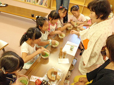 いつも活発でにぎやかな子どもたちも、おしとやかな大和撫子に変身。お茶とお菓子を味わっていました。