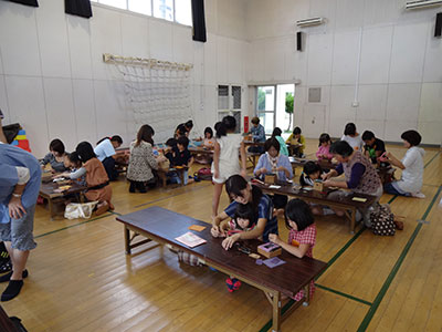 南中山子育て支援クラブ「ひまわり」主催で親子革細工教室を行いました。最初に講師の指導で、かなづちを使って革に穴を開けて模様を作る練習をしました。小学生達は、使い慣れないかなづちに苦戦していましたが、保護者に手伝ってもらいながら、様々な形の穴を組み合わせたり、自分の名前を模様にしたり、個性溢れる作品が出来上がりました。土曜日ということでお父さんの参加も多く、「子どもと一緒に作業できたのが嬉しかった。」「またこういった機会を作って欲しい。」などの感想をいただきました。講師の方と主催してくださった支援クラブの皆さん、どうもありがとうございました。