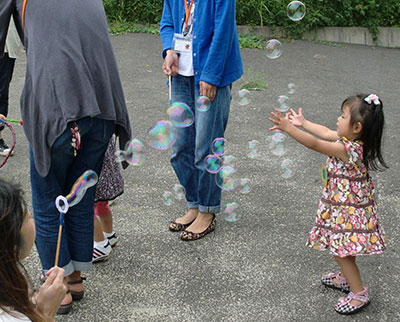 今回の幼児クラブは「シャボン玉あそび」心地よい風を受けながら小学校の校庭の一部をお借りして久しぶりの外活動です。手作りのシャボン玉製造機を手に、大小さまざまなシャボン玉が生まれては消え生まれては消え…子どもたちは夢中になって遊んでいました。保護者の作ったシャボン玉を遠くで待ち構えていて、小さな手で「パチン!」こんな光景も見られ、楽しい会になりました。