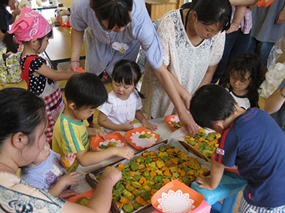 かわいいトマトが乗ったキッチンカーが来てくれました。赤、黄、緑、色とりどりの野菜入りクッキー作りをした後は、おいしいミネストローネとお弁当!