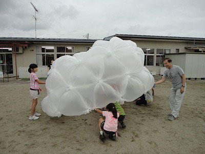 ビニール袋を膨らませ、それらをつないで六角形や五角形のブロックを作り、そのブロックを組み合わせてドームを作りました。小学生にとって、空気が漏れないように袋をひもで縛ることは、容易ではありませんでした。学生さんたちの力を借りながら、空気がもれないように頑張りました。