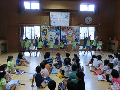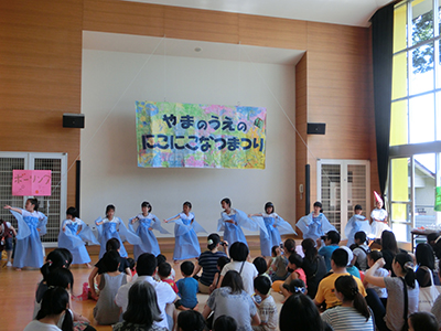 昨年に引き続き乳幼児親子を対象に「山の上のニコニコなつまつり」を行いました。オープニングは小学生による「アナと雪の女王」の踊りが披露されました。乳幼児親子の他、祖父母の方々も見えられ、お店屋さんごっこや工作コーナーなどで楽しみました。小学生スタッフ十数名の他、地域の民生委員の方、大学生、高校生(夏の体験ボランティア)、中学生(職場体験)の協力により実施することが出来ました。
