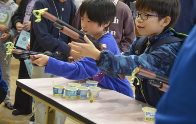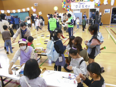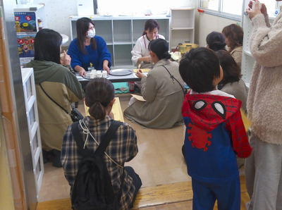 遊戯室では、防災のお話、サバ飯を親子で体験しました。