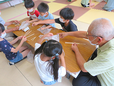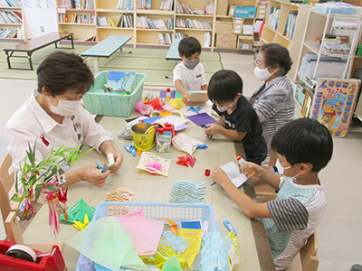 2021/07/24夏も本番を迎え、暑い日が続きます。児童館では地域の方々をお迎えし、七夕飾りを作りました。各々の飾りの由来を紹介した後、さっそく作業開始。和やかな雰囲気で作業が進みました。地域の方に教わりながら鶴を折ったり、折った紙に細かく切り込みを入れて網飾りを作ったりしました。様々な形の網飾りができあがり、時には「あれれ~?」という声もあがりましたが、それもまた良いものです。またたく間にたくさんの飾りができました。その後、短冊に願い事を書き飾り付け、カラフルで涼しげな竹飾りが完成しました。ご協力頂いた更生保護女性会の皆さん、参加してくれた皆さん、ありがとうございました。皆さんの願いが天の川へ届きますように。