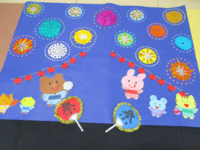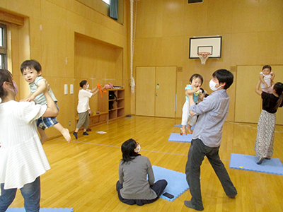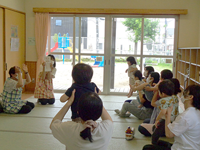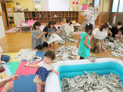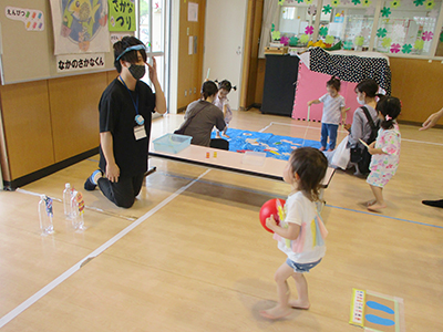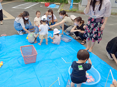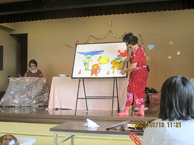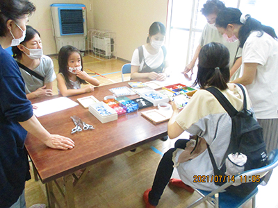 2021/07/15この日のお天気はあいにくの曇り空。少しずつ気温も高くなってきている中でしたが、7組の親子が行事に参加しました。 前半は室内でふれあい遊びや手作りおもちゃ作り。傘用のビニール袋をロケットにみたてて、シールで飾り付けをしました。窓の部分にお子さんの似顔絵を描いているお母さんもいらっしゃり、オリジナルの可愛いロケットができました。 後半は完成品を持って、いざお外へ!走れば走るほどたくさんの空気が入って膨らみます。みんなで館庭を自由に走り回り、空を舞うロケットの姿に胸を弾ませていました。 7月後半からは夏休みに入るため、幼児さんの行事は少しの間お休み。また元気な姿でお会いできるのを楽しみにしています!