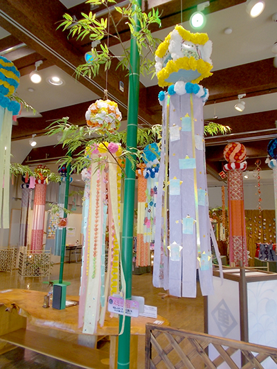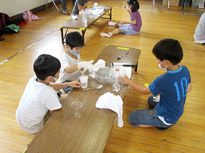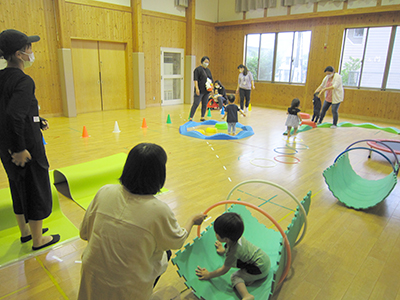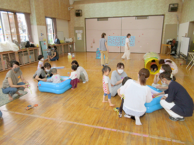集会室には、祭り提灯や簾に朝顔のオブジェが飾られ、夏祭りの雰囲気を盛り上げました。10組21名の参加申し込みがあり、検温や手指消毒等、感染防止対策を徹底した上で実施しました。いつもの準備体操ののち、ぷよぷよボールプール&スカーフプール、動物風船づくり、魚釣りの3つの遊びのコーナーと記念撮影コーナーが設けられ、BGMに祭囃子の軽快な音楽が流れる中、夏祭りが開演しました。プールコーナーでは浴衣のまま水無しプールに入り、楽しむ幼児の姿が印象的でした。動物風船づくりコーナーでは、風船にかわいいお目目とお耳そして足をつけて自分だけのペットを作りました。魚釣りコーナーではなかなか釣れない幼児に代わってお兄ちゃんがバケツ一杯に魚やクラゲを釣り上げていました。対しい時間は瞬く間に過ぎ、「さよならあんころもち」で終演となりました。