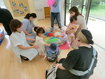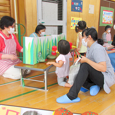 2021/07/127月12日(水)は、0・1歳児親子対象「うさぎちゃん」の開催日。夏にふさわしく「おまつりごっこ」を開催しました。