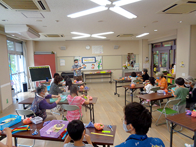 「アスレチック」「お魚パニック」「水ヨーヨーつり」「おもちゃ作り」と、いろいろなコーナーを準備しました。「アスレチック」では最後に大玉を転がすとパッと絵が変わり、アンパンマンと花火が飛び出す仕掛けがとても好評で「またやりたーい。」と何度も挑戦する幼児の姿が見られました。「おもちゃ作り」では、透明コップからバーンと大きな花火が飛び出すおもちゃを親子で作っていました。シール貼りが楽しくてやめられなくなる幼児もいて、微笑ましい光景が見られました。おみやげの大型風船も大好評でした。参加した母たちからは、「地域の夏祭りも皆無くなってしまったけど、児童センターで夏祭りができ、甚平を着せられる機会ができて嬉しいです。」というお声を頂くことができました。