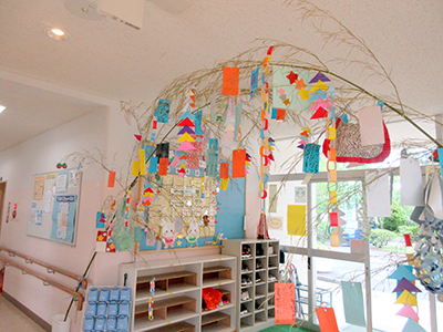折り鶴や提灯などの飾りを折り紙の得意な子が、わからない子に教えてあげたりしてして作り、笹竹を色とりどりに飾りつけました。短冊の願いごとには、現実的な願いごとや夢のある願いごとなどが様々に書かれていました。