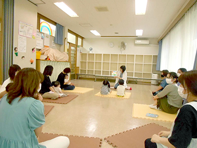 久しぶりのおはなし会を楽しみにしていた親子さんでお部屋がいっぱいになりました。絵本の前で座ってじーっとお話を聞くお友達。おはなし会が始まったことに気づき「私も!」と思ったのか、図書室の本を一冊ずつ取り出し、並べ始める女の子。お部屋を出たり入ったりしながらも、動物が出てくる場面になると絵本のそばまで近づいていく男の子。それぞれが楽しめたおはなし会になりました。三つ目の絵本「ちょっとだけ」は、お母さんが楽しめる素敵な時間になりました。今回のおはなし会は地域にお住まいの石川さんでした。次回のおはなし会(9月3日)は、『おはなしレインボー』のみなさんです。お楽しみに…。
