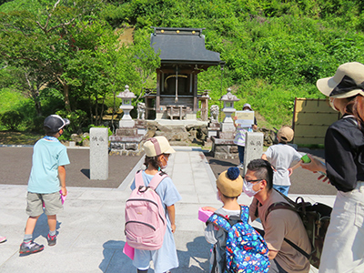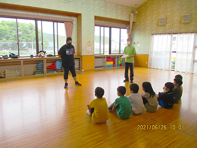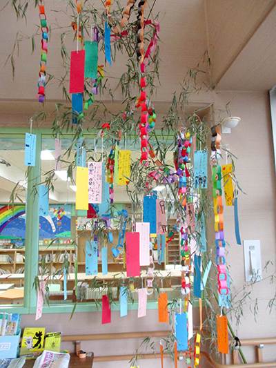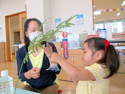 2021/06/26地域を知り、地域の魅力を再確認する3回シリーズの【たGO!探検隊】。第1回目はロビーに飾る七夕の竹を取る『竹取り』です。朝から、開催するか迷う小雨模様でしたが、出発時間になると雨が上がり、子供たちは、大喜び!元気よく「行ってきます。」の声で、竹藪を持っている地域の方のお宅を目指して出発しました。マンホールの絵柄や公園などを探検しながら、到着すると子供たちは、お宅の大きさにびっくり!毎年七夕の竹を頂いている感謝のメッセージを渡し、いよいよ竹藪へ!大きな竹1本と、若竹を一本ずつ頂きました。帰り道は、「重い。」と言いながらも頑張る子供たち。何とか持ち帰りすぐに短冊を飾りました。1日も早いコロナウイルスの終息を願って!