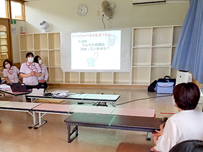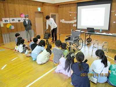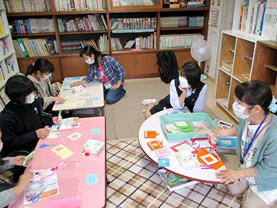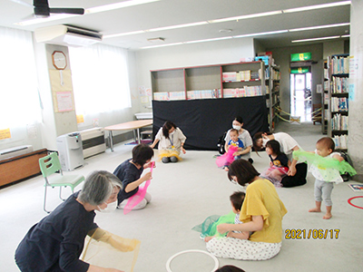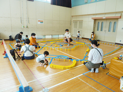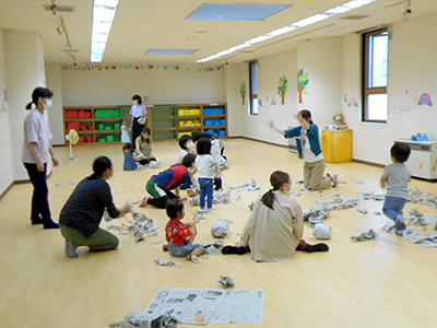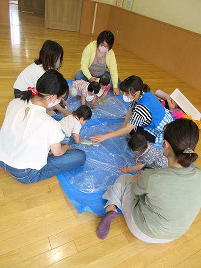 ギュギュっとひねってくぐらせて「飛ぶねずみ」と「ちょうちょ」を作りました。割れるのが怖くて耳をふさぐと、あら?作る手が足りないぞ?!ジュニアリーダーのお姉さんに手伝ってもらったり励ましてもらいながら頑張って風船をひねり、完成した「飛ぶねずみ」は可愛さもひとしお。誰が一番飛距離が出るか飛ばしっこを楽しみました。お次は5つの風船を順番に膨らませて組み合わせ…ふわふわ動く華やかなちょうちょの出来上がり!帰る前には岡本先生からのお土産もいただき、風船で大きく膨らんだカバンを持って笑顔で解散した参加者の皆さんでした。