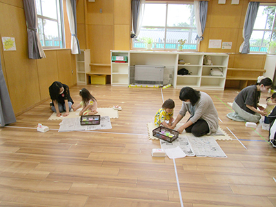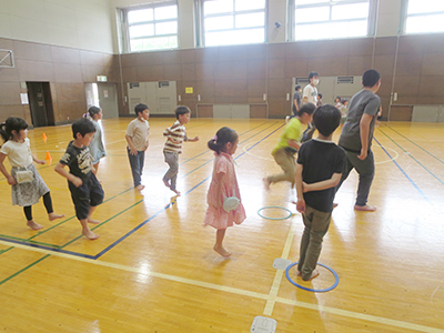 元気よく準備運動をした後は、メインの運動遊びです。カラーコーンで形作ったトラックを行進や駆け足、両足跳び・けんけん跳びなど色々な方法で進むという、一見簡単な基本動作にも思えるこの遊びは『トムとジェリー』という遊びにつなげるための大事な段階の一つです。子どもたちはカラーコーン同士の間にある架空の線を思い浮かべながら進むことで、頭と体の両方でトラックを覚えました。次回は『トムとジェリー』の導入に入ります。