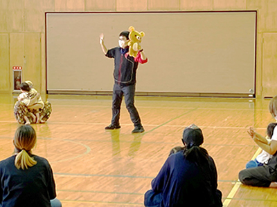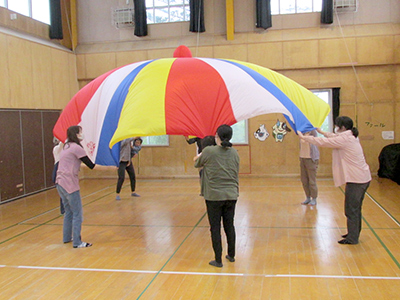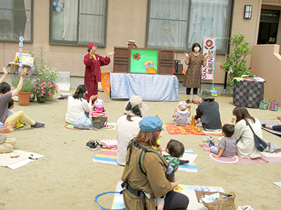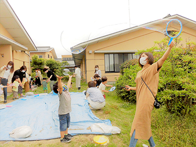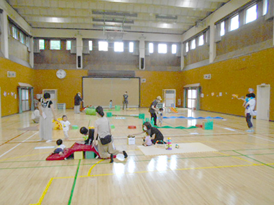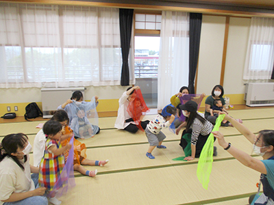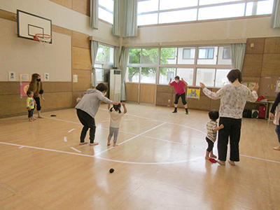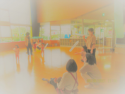 2021/06/08今年度初めての「にこにこひろば」は乳幼児親子対象の行事です。広い遊戯室で音楽に合わせてのびのびと体を動かしたり、わらべ歌で親子でふれ合い、子どもたちはうれしそうです。一人ずつ名前を呼ばれると「はい」と元気に手をあげ、ますますにこにこ顔になりました。