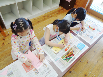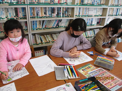 今回は、「下敷きつくり」です。小学生は自由に絵を描いたり、児童館で用意した塗り絵に色を塗ったりしました。次は、好きな色の台紙に貼ってラミネートフィルムに挟みます。「これがどうなって下敷きになるの?見てみたい!」との声に、「熱いから触ってはいけないよ」と約束をして、ラミネートの機械に入れる様子や出てくる様子を見た小学生は大喜び。オリジナルの下敷きが出来上がる工程も見ることができました。友達同士で見比べたり、お迎えのお母さんに見せ、話していました。連休明けの今日から、学校でも使っていることと思います。