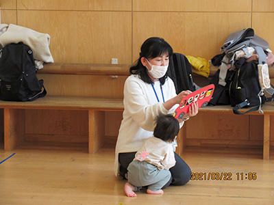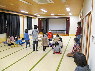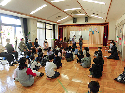 手品の発表に、子ども達は身を乗り出し、ディアボロの、かっこいい技の披露には、拍手喝采!紙芝居は、園庭の木の物語。一枚一枚の絵は子ども達が描いたもので、読み方も堂々としていました。なぞなぞ大会は面白い問題がたくさん!正解すると首にレイをかけてもらいます。一年間を振り返るスライドショーでは歓声が上がり、大繩の発表は最高記録が出て大盛り上がり!最後に子ども達手作りのしおりや子育て支援クラブ、児童センターからプレゼントをもらいました。楽しい時間はあっというに過ぎ、一年間を締めくくる素敵な会となりました。