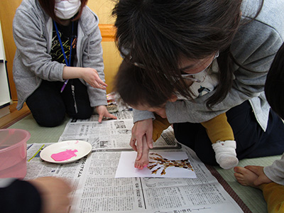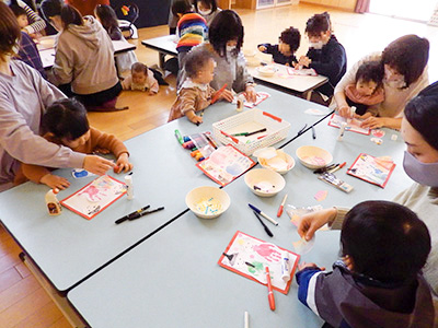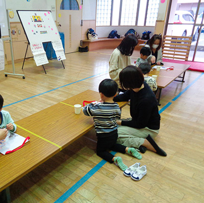 初めは、名前を呼ばれても恥ずかしくてお母さんに隠れてしまっていた幼児さんも、今では元気にピンと手を挙げて返事できるようになったり、静かに絵本を見られるようになったり随分成長しました。そして、お友だち同士もお母さん同士もすっかり仲良くなりました。この日は、皆でじゃんけん列車をして、パネルシアターを楽しみ、館長から記念のおわかれカードを受け取ってシール交換もしました。お友達の名前が書いてあるシールを、「お願いします。」と言いながら集めておわかれカードに貼っていきます。それぞれが全員分のシールを貰って、大事そうにながめていました。