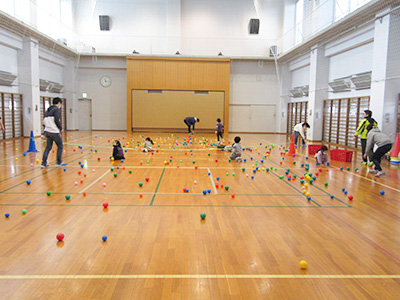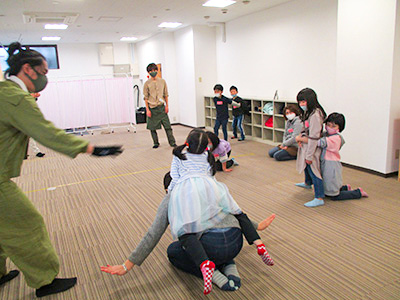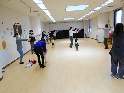 2021/02/24パワフルで笑顔の素敵な島貫照美先生による「親子ビクス」を行いました。開始前から参加者一人一人に声をかける先生の周りから笑い声が聞こえてきました。お部屋も温まり和やかな雰囲気の中、始まりました。初めは、背中のストレッチ。ゆっくりじっくり時間をかけて腕を伸ばし肩・背中の筋肉をほぐします。背中がジワジワ温かくなり、気付けば足元もポカポカしてきました。子どもたちも真似をして動きます。次は、軽快な音楽が流れる中お母さんと手を繋いで歩いてジャンプしたり、フープをくぐり抜けたりして