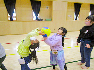 そして「鬼は~外!福は~うち!」の掛け声で豆まきの練習をしました。そこへ、「ドンドン!!」ドアを叩く音が響き、女の赤鬼と男の青鬼が登場!!ドキドキした表情を見せていた子どもたちでしたが、泣かずに豆ボールをぶつけることができました。鬼と仲良くなり、福豆をうれしそうに受け取り、「鬼のパンツ」を一緒に踊りました。