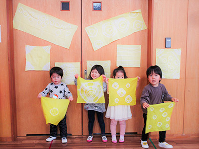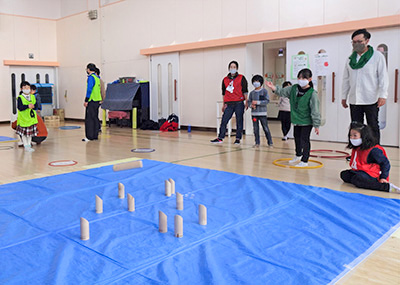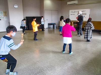 お手玉をお餅に見立てて餅つきをしたり、リンゴやミカンに見立てて頭に乗せて、ポトンと落としたりする遊びは、わらべ歌のリズムがなんとも心地よく、子ども達にも大人気。キャッキャと笑いながら何度も何度も繰り返し遊んでいました。紙芝居や絵本にも親しみながら、あっという間に時間は過ぎていき、ひろみさんとは「またあそぼうね」と約束して終了となりました。