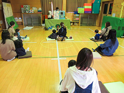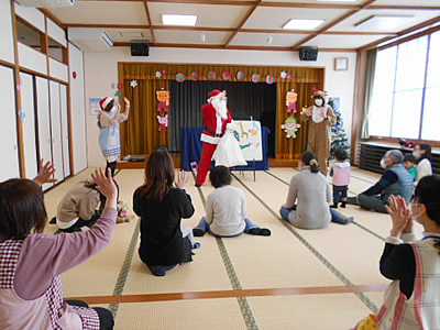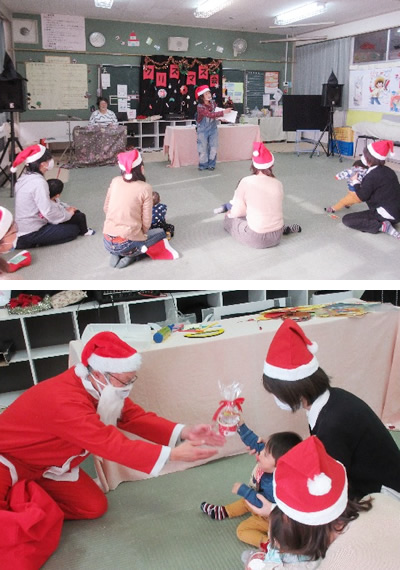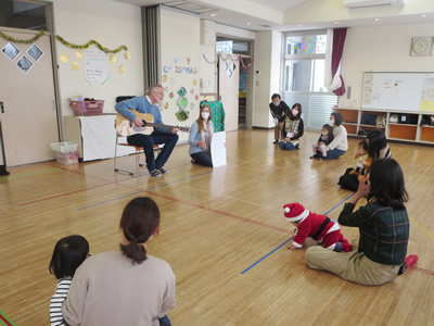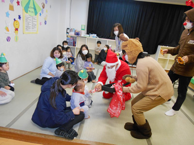 朝の挨拶から始まり、一人一人の名前を呼びます。かわいらしい声の返事は、一気に部屋をも暖めてくれるパワーがあります。体操をした後は、クリスマス会には欠かせないツリー型の帽子作りをしました。親子で会話をしながら素敵にできた帽子を嫌がらずにかぶり、少し難しい⁉大型ツリーパズルを完成させました。クリスマスの雰囲気が出来たところで職員からのプレゼントです。4曲のハンドベル演奏です。3日間の猛練習をした成果が発揮され、静かにベルの音色に耳を傾けてくれていました。最後には「ウォッホッホ」としか答えないサンタさんと「トナトナ、カイカイ」としか返事しないトナカイ2匹が登場し爆笑の会となりました。