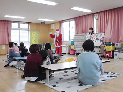そしていよいよサンタの登場です!「メリークリスマス!」と大きな声で会場に入ってくると、よい子たち一人一人にプレゼントを渡しました。そして小っちゃい声ながらうれしそうな笑顔を浮かべて、「ありがとう」とお礼を言う幼児さんがとても印象的でした。
