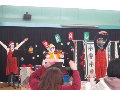 さて、今を時めく人気アニメ「鬼滅の刃」の主題歌「紅蓮華」をバイオリンが演奏してお楽しみ会の始まりです。続いて、こぎつね、あわてんぼうのサンタクロース、エビカニクスなどをピアノとバイオリンが競演しました。そしてところどころにパントマイムが入り、どっと会場がわきます。