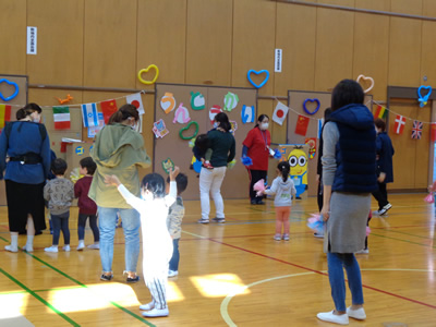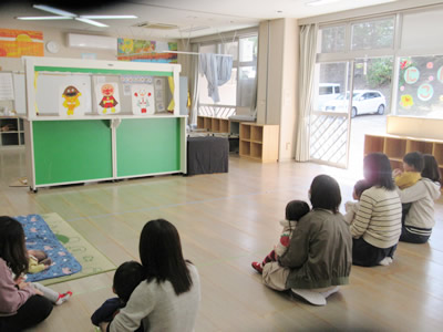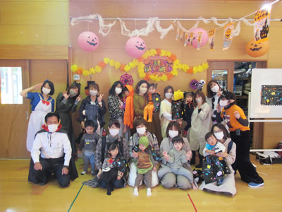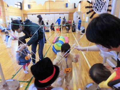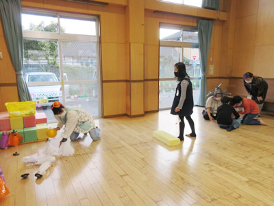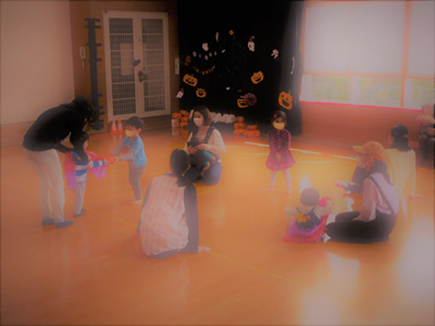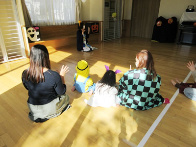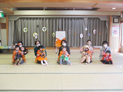 2020/10/29今年度初めての0歳児のキューピーちゃんの行事には、3組の乳児親子の参加がありました。「さんぽ」の曲に合わせて行進をし、ふれあいあそびと体操をしました。赤ちゃんとお母さんは初めて尽くしのことにニコニコ笑顔もみられました。ハロウィン工作は、かぼちゃのコップのストローに空気を吹き込むとネコが出てくるかくれんぼネコです。とびだしたネコを見てびっくりした表情で動きが止まったり、触ったりする姿はとても可愛らしかったです。遊戯室の広い部屋で、ハイハイをして思いっきり動き回った赤ちゃんたちは帰ったら、ぐっすりお昼寝のことでしょう。「また、遊びに来ます。」と帰っていくお母さんの言葉はとてもうれしかったです。