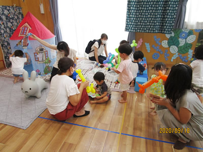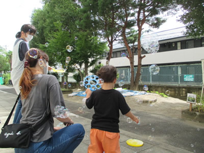 乳幼児行事が少しずつ行えるようになったので、今月は『にじいろタイム』に、「しゃぼんだま」をしました。親子で体操したり、ペープサートを見たり、作ったりした後、外へ出てしゃぼん玉遊びを行いました。しゃぼん玉をするのに絶好のちょっと曇った日で、大きいしゃぼん玉もたくさんの小さいしゃぼん玉も、長い時間ふわふわ飛んで、ゆっくり楽しみました。まだ、参加人数は少ないのですが、その分ゆったり遊ぶことができました。来月の『にじいろタイム』も楽しい行事を企画していますので、どうぞ、お申し込みください。ご参加をお待ちしております。